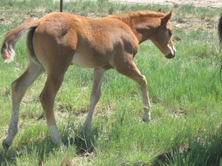 This nice colt looked solid sorrel at first but now that he is loosing his baby coat, his pretty roan color is coming out. He is well put together and a fat little guy! This cross typically is very trusting and easy to work with and wants to be your friend. Don't miss this guy. Nice head, pretty face.