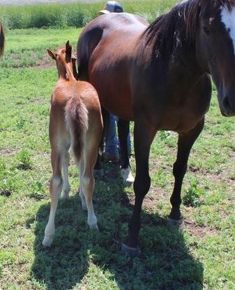 Kate, Stormi's dam, is a big nice heavy bone and muscled mare of 15.2. She always puts a great frame and heft on her foals, as well as a very nice cooperative mind. This one is a gem in a plain sorrel wrapper. She is also the youngest of our foals but growing very quickly