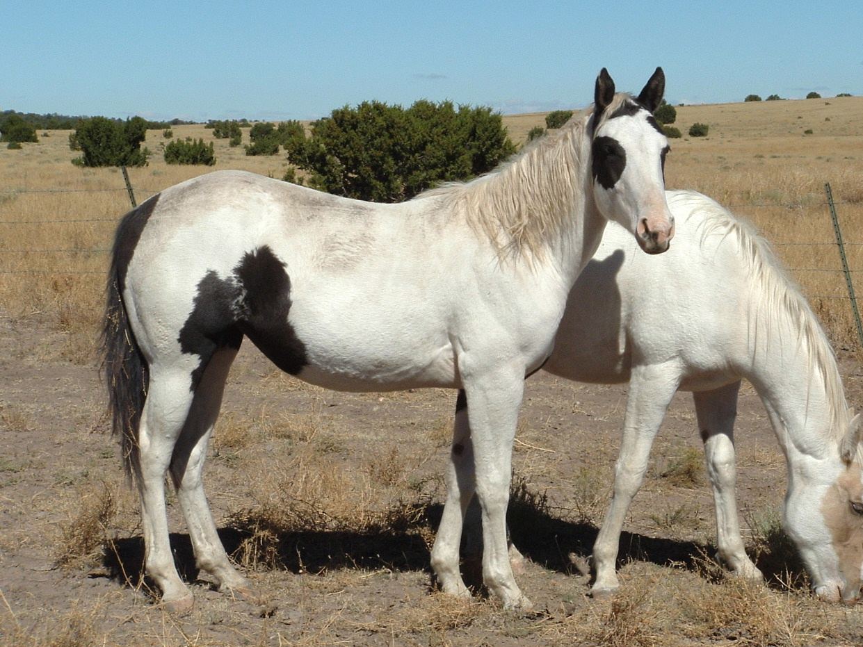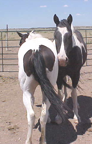 Sting is a first foal but you can't tell it to look at her. She is just a big, stout and very correct yearling. She has a very sweet temperament and is quiet to handle. In these pictures she is standing next to a six year old horse we raised and he is no small horse. She is quite the girl! Has the speed you'll need to keep ahead of the posse and she has enough strength and size to jerk steers or prettyy much do anything you want her to. Her 2005 full sister is built just like her, but she is solid black instead of colored. These girls will be really tremendous additions to your riding barn or broodmare band.